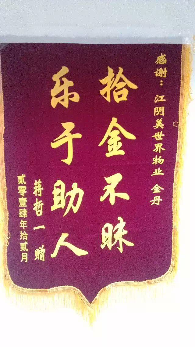 2014年12月美世界驻江阴东院项目管理处收到一面锦旗,表扬我司员工金丹同志拾金不昧、乐于助人的先进事迹。失主蒋哲一十分感谢金丹同志对自己的帮助,特赠锦旗以示感谢。